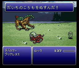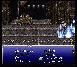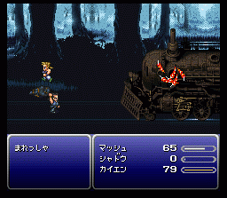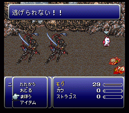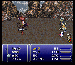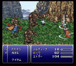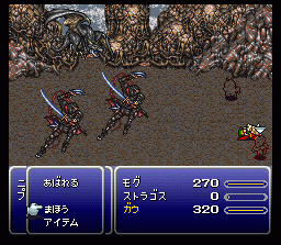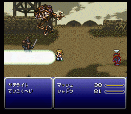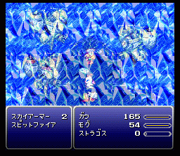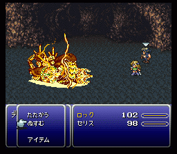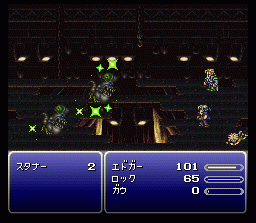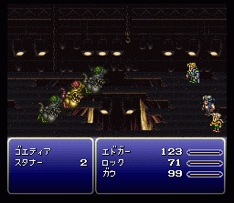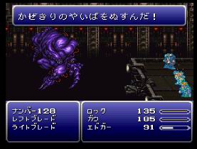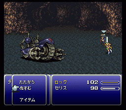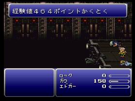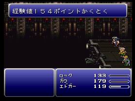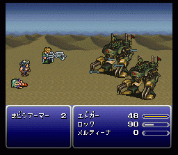 这场战斗会造成强制的Back Attack,所以要预先让角色站在前排。魔导装甲的HP不多,蒂娜用火魔法、艾德加用オートボウガン,洛克注意回复,很快就可以结束战斗。