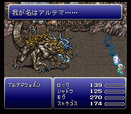 嘎走后,重整队伍:洛克、莫古、斯特拉哥斯。洛克的作用说过了,万年小偷+保姆,而莫古的LV11将起到决定性的作用。6级的影忍加入后,重新走一遍,来到UltimaWeapon前。全员换上リフレクトリング和エルメスの靴。世界崩溃前最后一场恶战开始了……